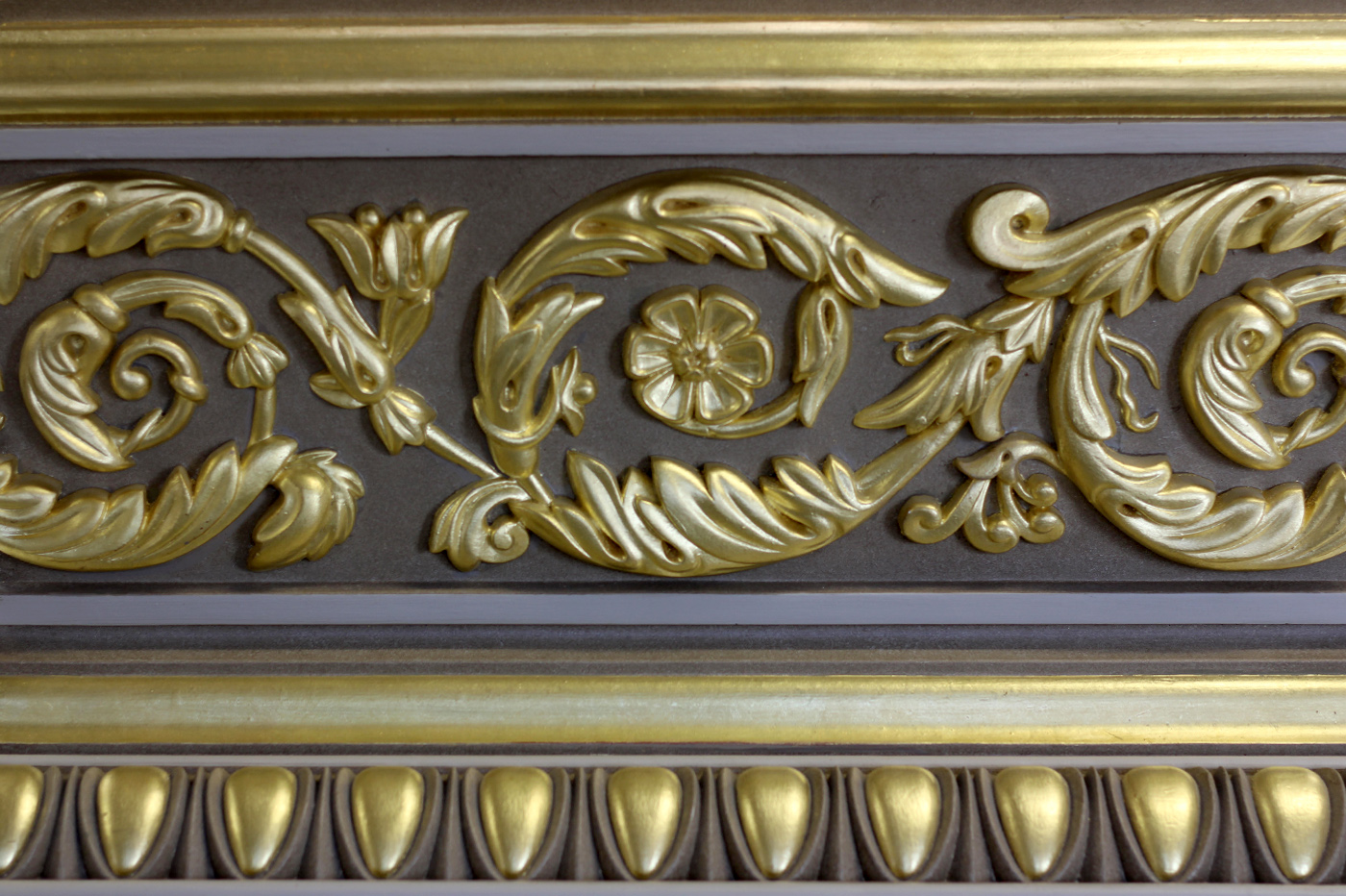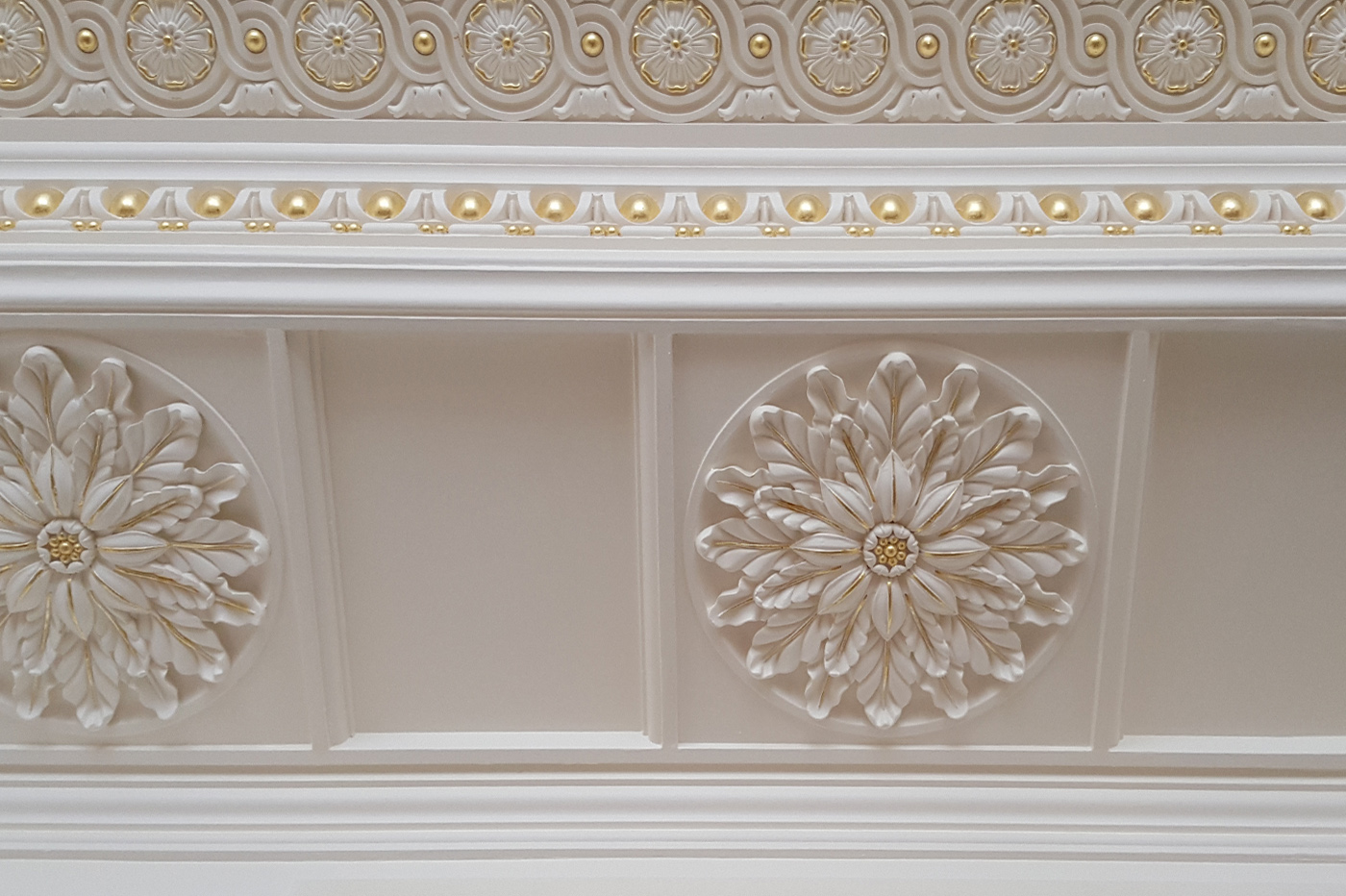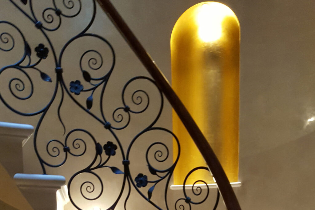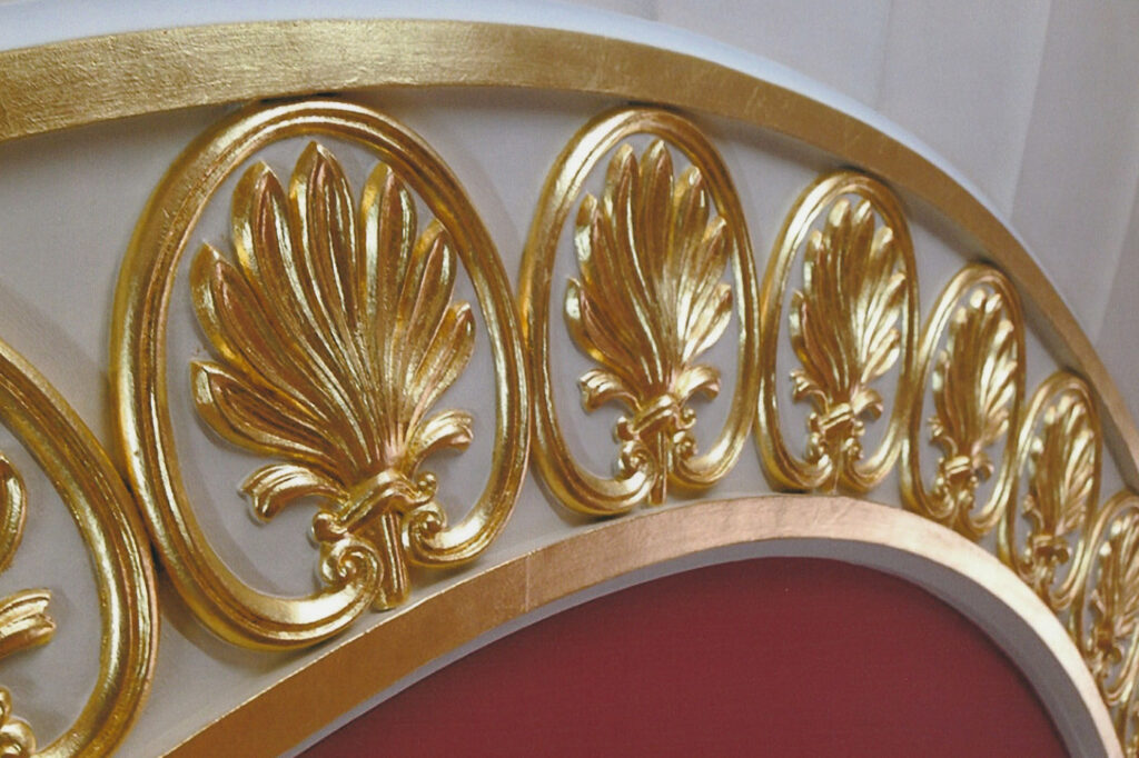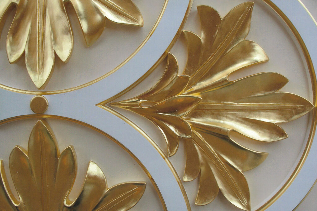 Our experience ranges from historical to traditional interiors right through to contemporary flat surfaces. The majority of our work is architectural oil gilding, nevertheless we do carry out water gilding restoration.